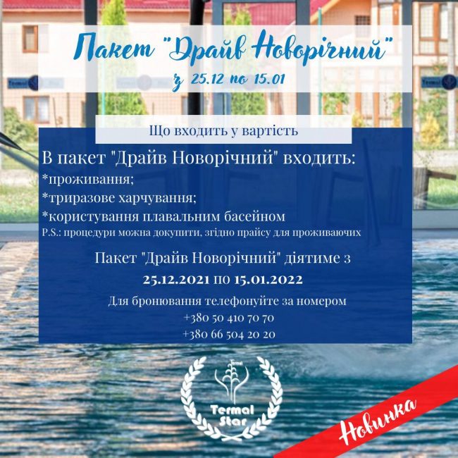 3 15.02.2026 року – термальний басейн закривається на плановий капітальний ремонт. Бальнеологічне відділення працює у звичайному режимі. Про початок роботи термального басейну повідомимо завчасно. Стежте за новинами.